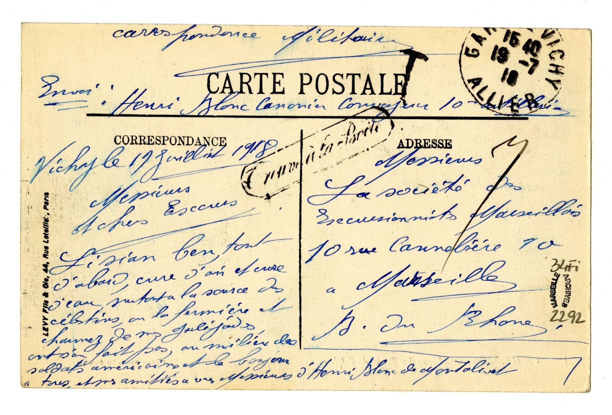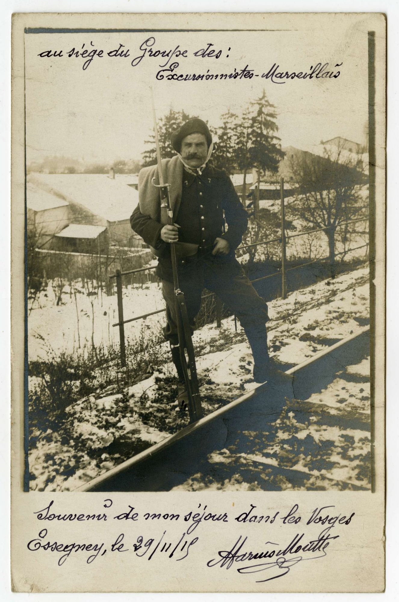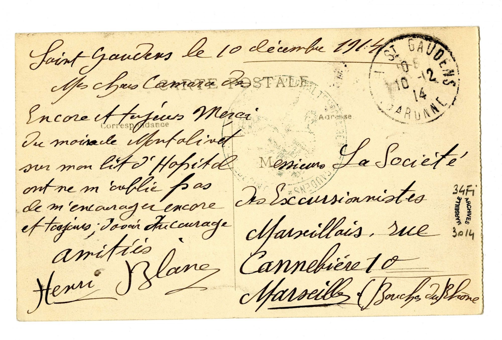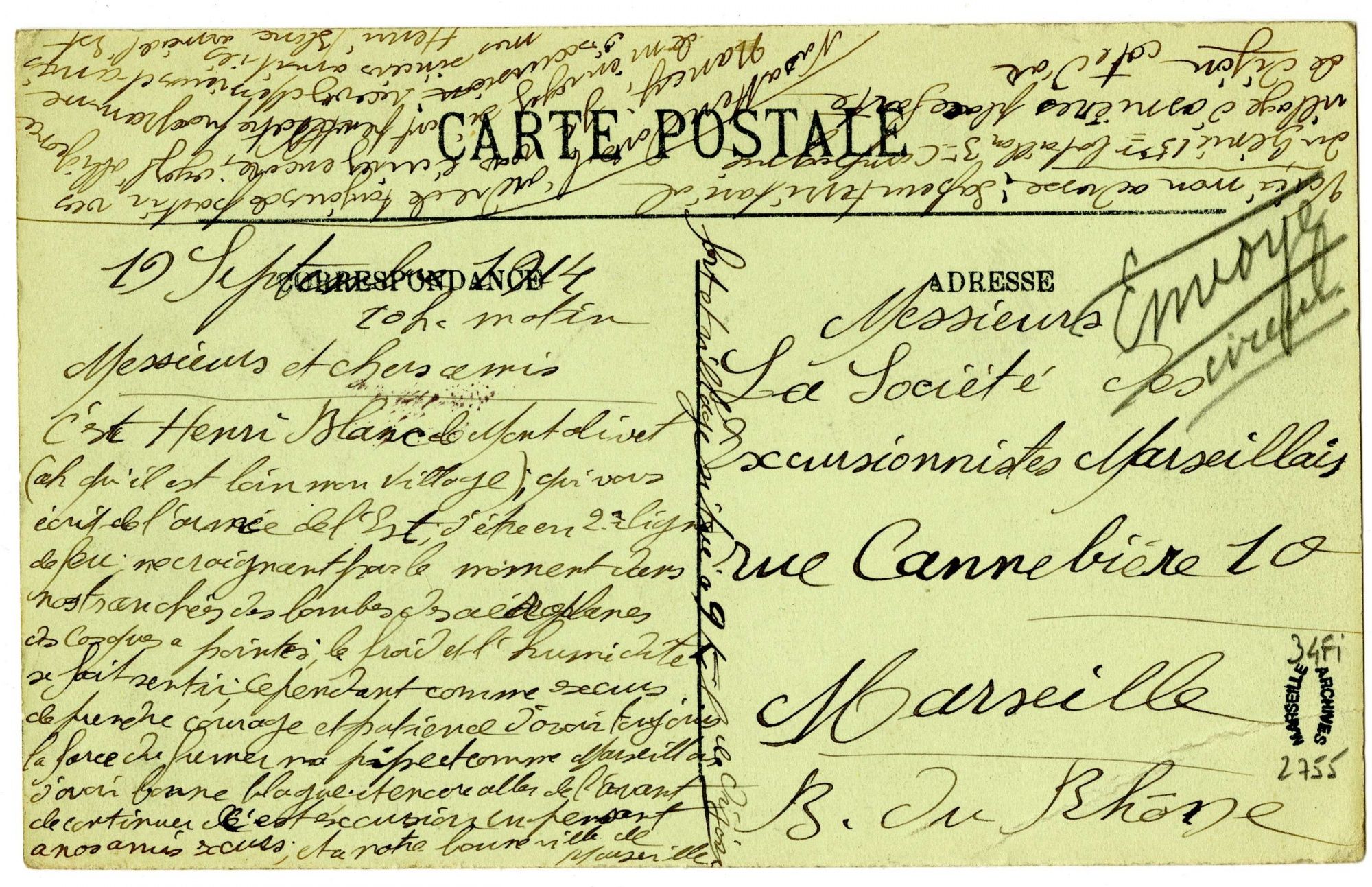 Ces cartes postales ont été envoyées à la Société des Excursionnistes marseillais par Henri Blanc, maçon natif de Montolivet (Marseille), membre excursionniste qui s’est surnommé lui-même " le poilu d’Arras ". Il y décrit la guerre de manière très concrète dans un langage coloré. Il est engagé à 38 ans dans la territoriale comme sapeur du Génie. Hospitalisé à Saint-Gaudens pour un pied gelé, il est réincorporé comme canonnier convoyeur puis dans l’artillerie pour finir comme instructeur.