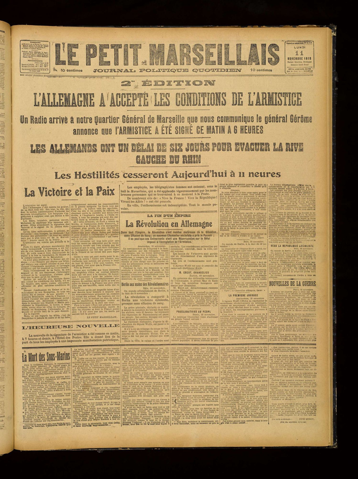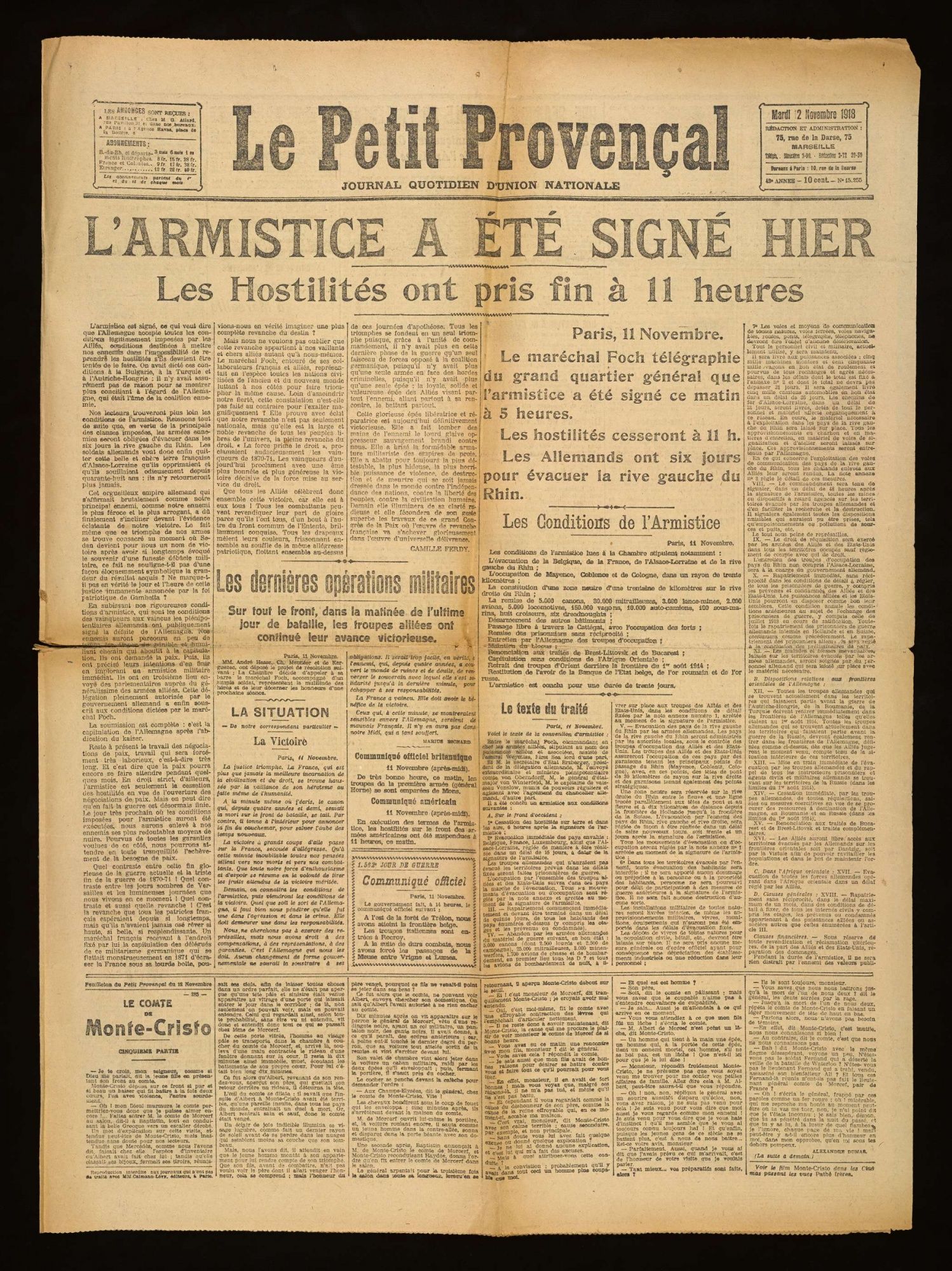 Le dernier et le plus puissant de non ennemis, le vrai responsable de toutes les ruines, de toutes les misères et de tous les deuils, celui qui avait divisé la force, a subi les conditions imposées par le maréchal Foch au nom de l'entente.