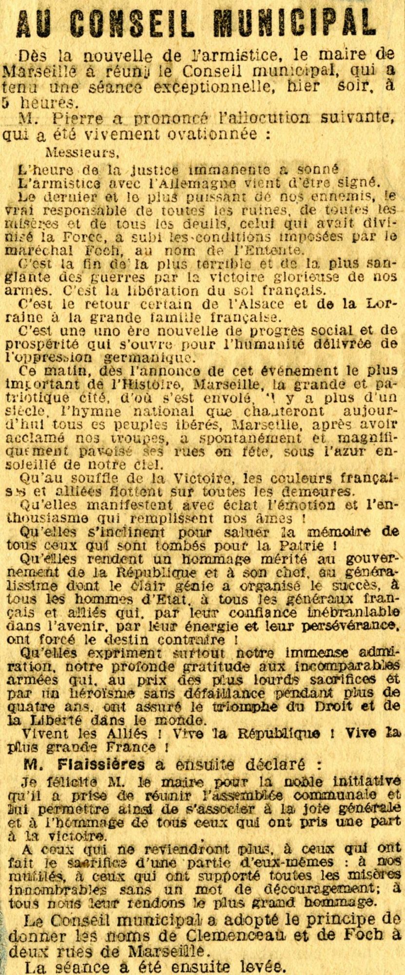 Déclaration d'Eugène PIERRE, Maire de Marseille au sujet de la signature de l'armistice avec l'Allemagne, suivie de la déclaration de Siméon Flaissières, séance du 11 novembre 1918