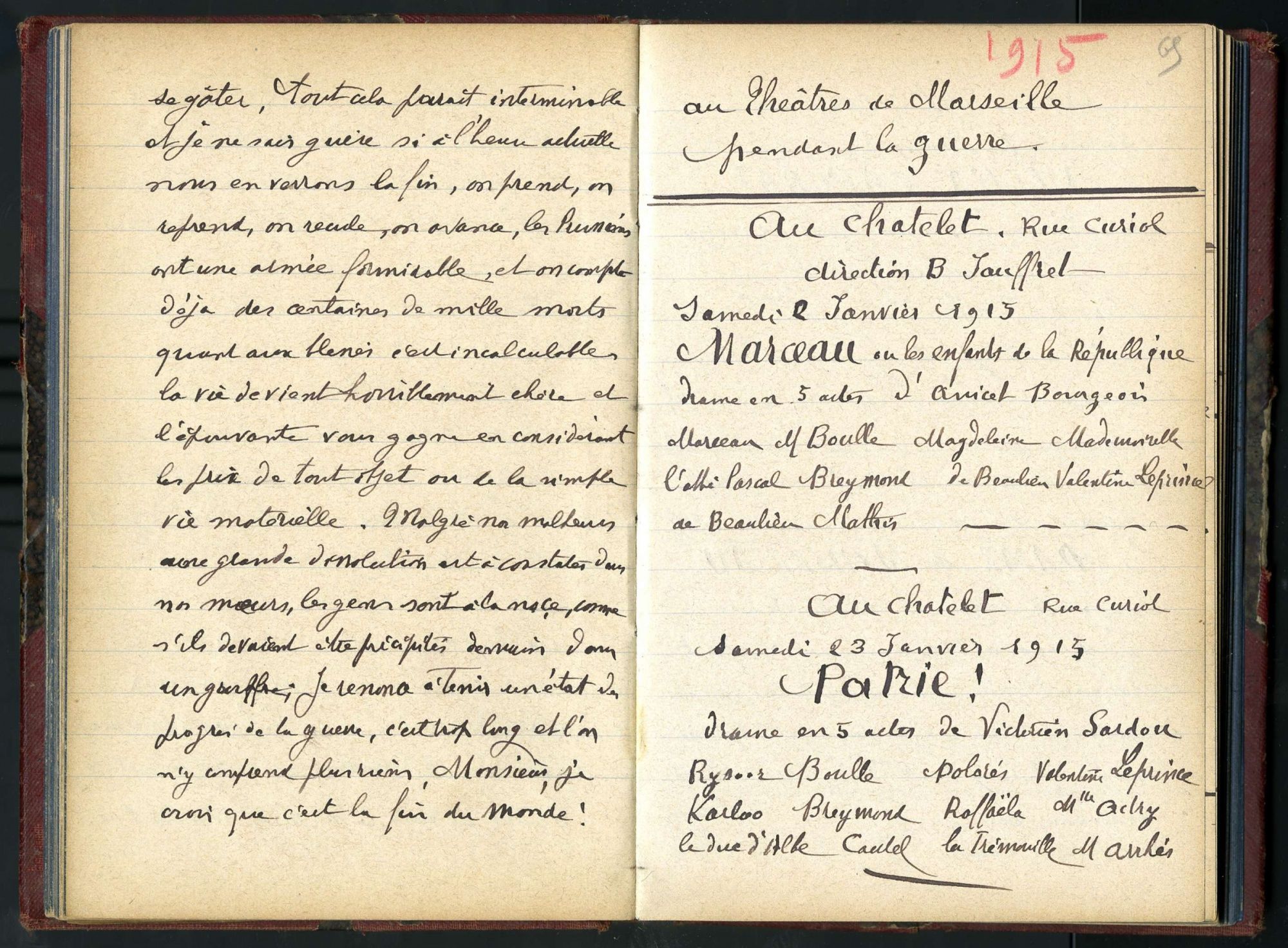 Pourtant, Marseille, base arrière des armées, avec ses dépôts pour soldats en transit, ses trafics, ses activités, sous un ciel qui parait si loin des malheurs de la guerre, présente un aspect qui étonne : rues et magasins souvent étincelants de lumière en dépit des restrictions, foule bruyante et joyeuse fréquentant en masse les cinémas qui ont rouvert à l’automne 1914, tout comme les théâtres en 1915.