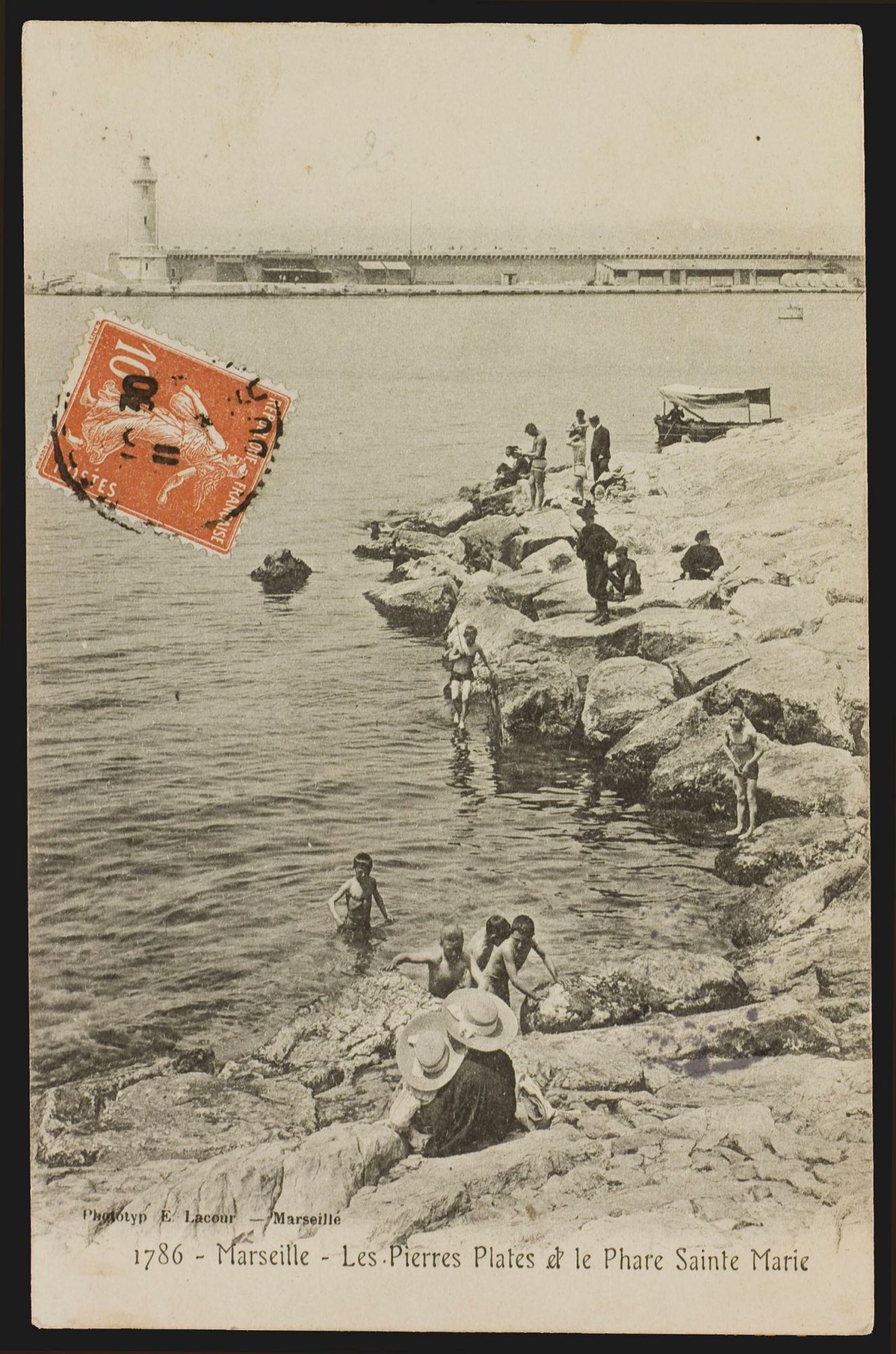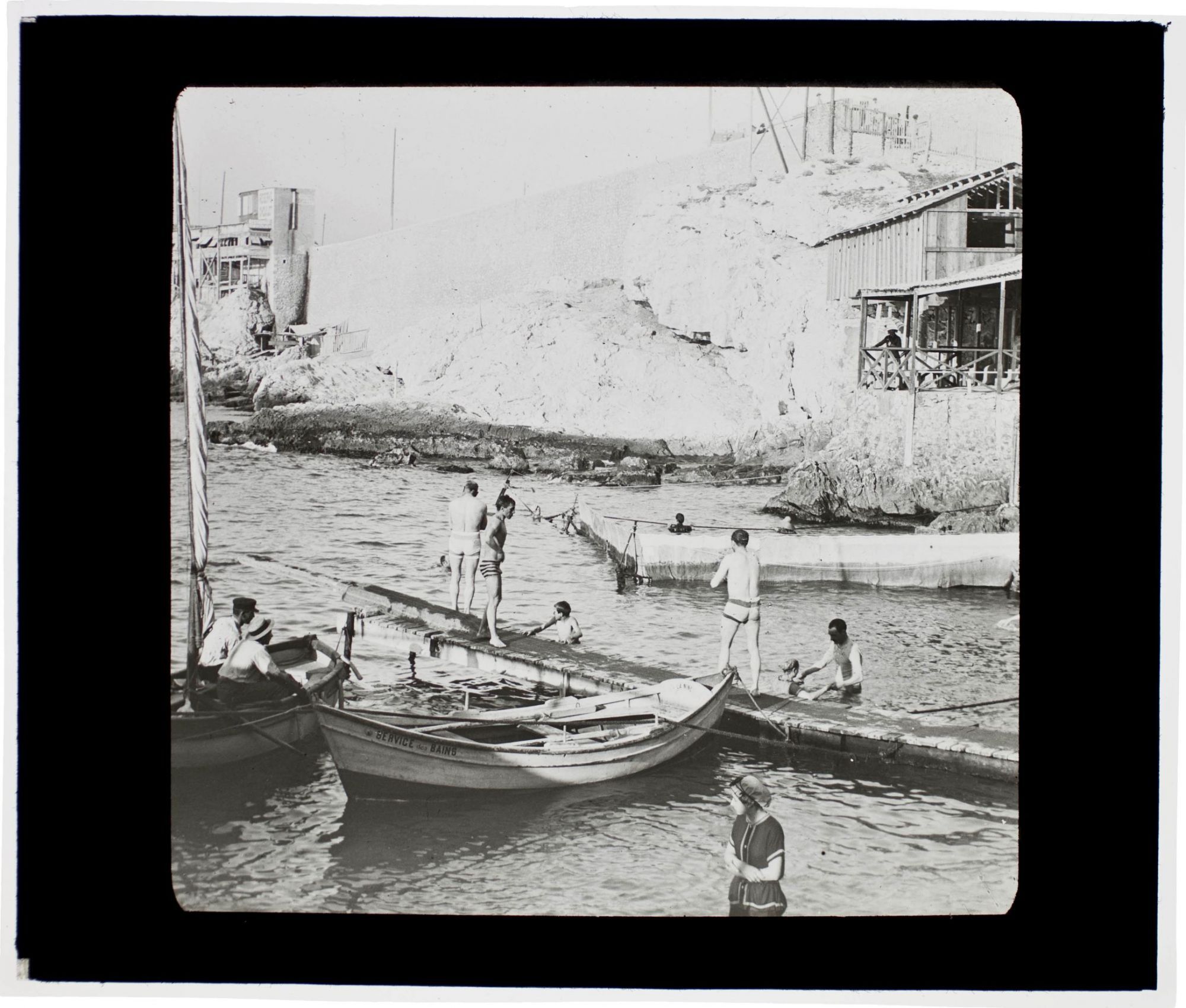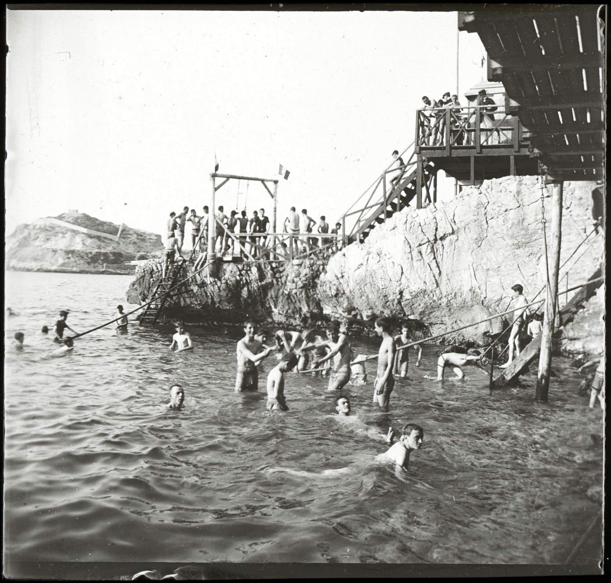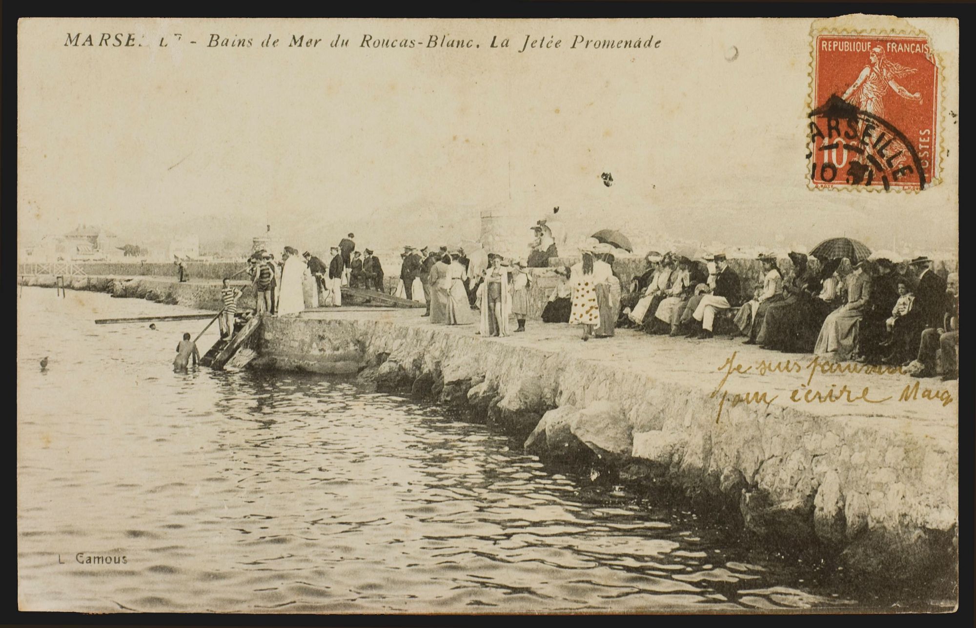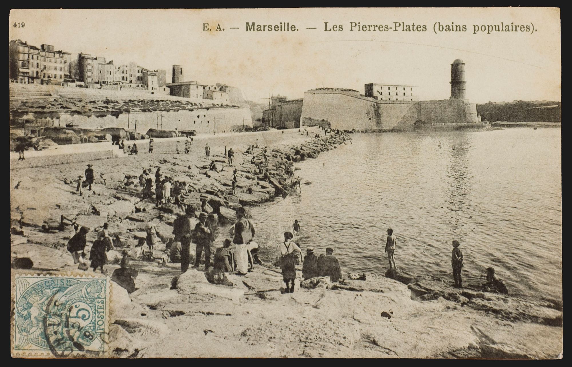 Depuis les rochers des anses et petites criques des calanques ou du bord des plages de Bonneveine, du Prophète ou des Catalans, les Marseillais ne manquent pas d'accès à la mer, en tant que lieu de loisirs. Et ils ne s'en privent pas ! Les nombreuses vues de promenade, pêche ou excursion et pique-nique en hiver et de baignade en été, présentes dans les divers fonds iconographiques des Archives, en témoignent, tout en marquant, au-delà de l'évolution des moeurs et des coutumes vestimentaires, une certaine pérennité et constance des modes, usages et lieux de fréquentation : en famille sur les plages du Prophète et de Bonneveine, entre amis dans les calanques et pour faire de fols plongeons dans la passe du Vieux-Port !