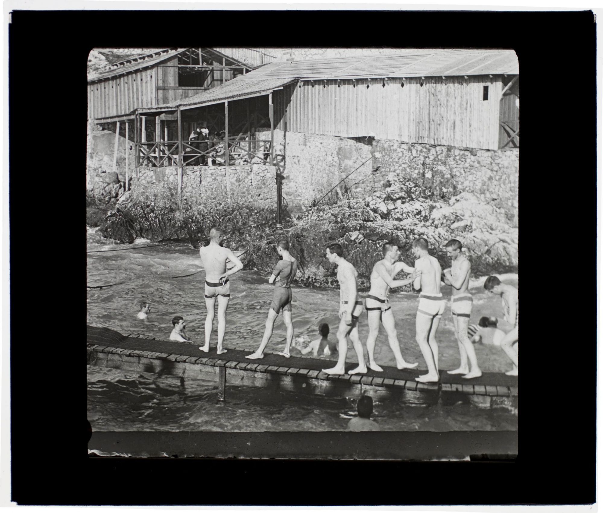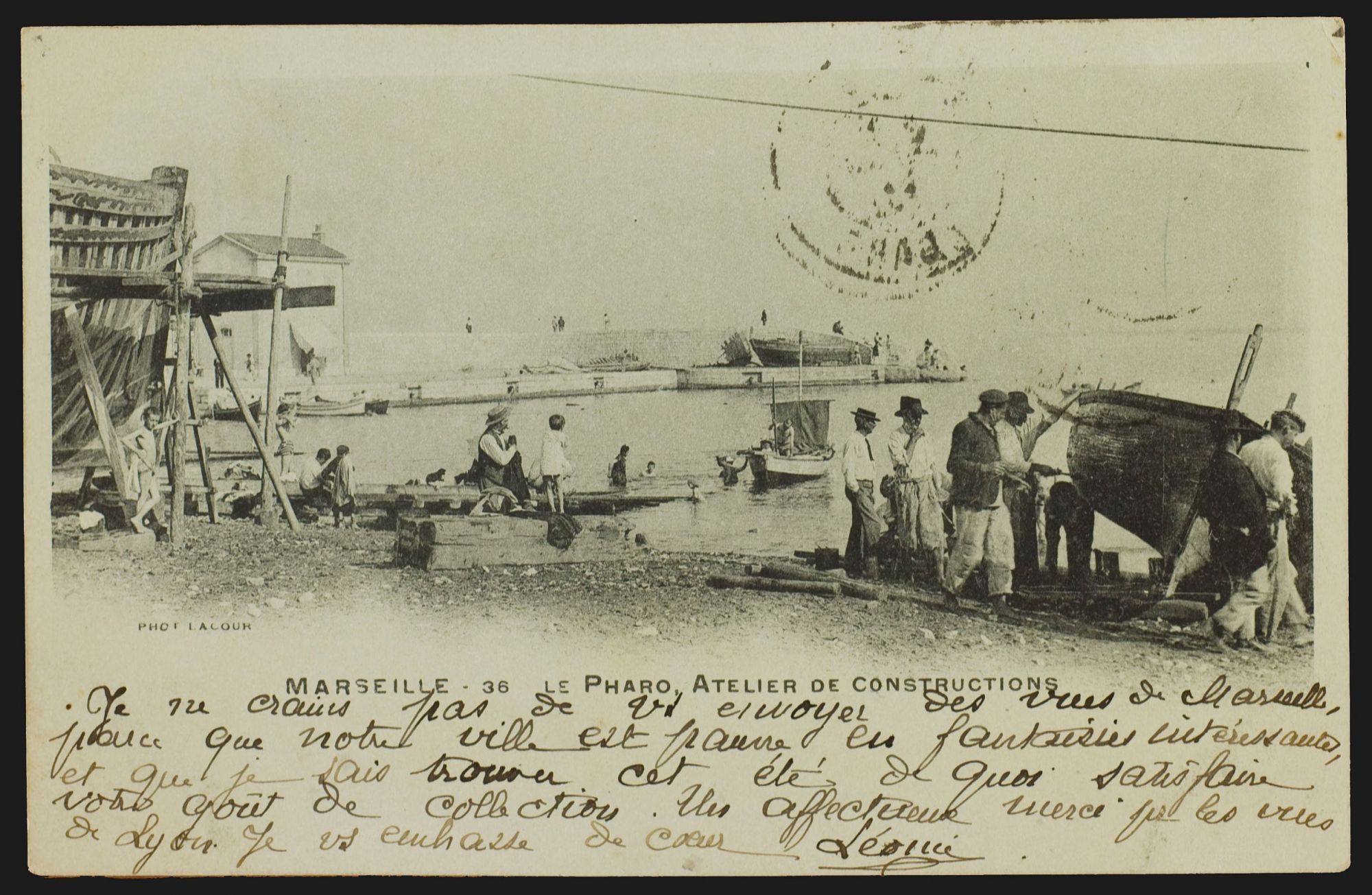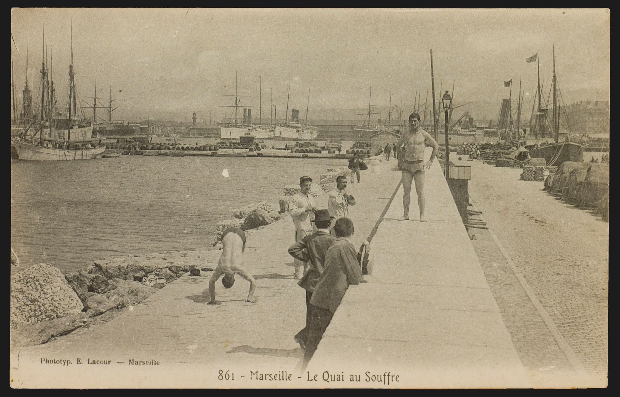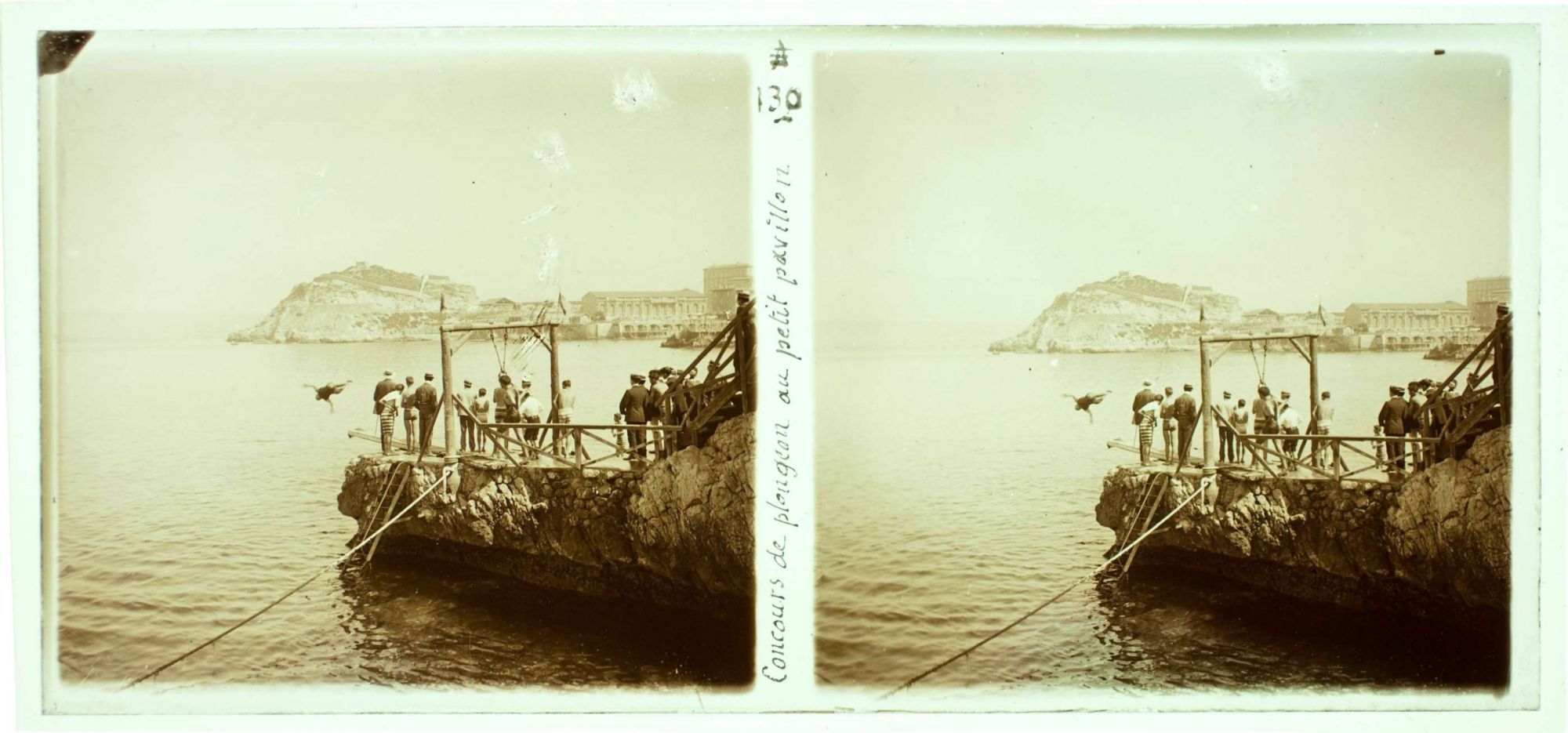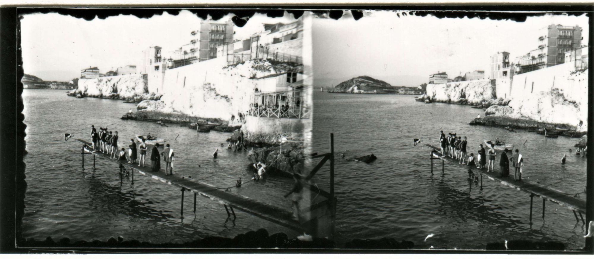 Depuis les rochers des anses et petites criques des calanques ou du bord des plages de Bonneveine, du Prophète ou des Catalans, les Marseillais ne manquent pas d'accès à la mer, en tant que lieu de loisirs. Et ils ne s'en privent pas ! Les nombreuses vues de promenade, pêche ou excursion et pique-nique en hiver et de baignade en été, présentes dans les divers fonds iconographiques des Archives, en témoignent, tout en marquant, au-delà de l'évolution des moeurs et des coutumes vestimentaires, une certaine pérennité et constance des modes, usages et lieux de fréquentation : en famille sur les plages du Prophète et de Bonneveine, entre amis dans les calanques et pour faire de fols plongeons dans la passe du Vieux-Port !